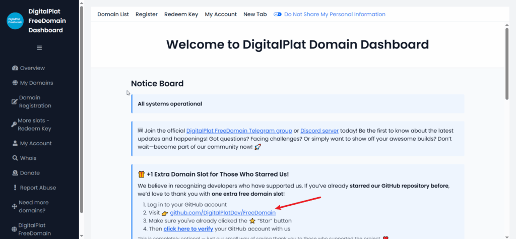 有时候发现想要做一些网站,但是不想花太多钱,特别是域名方面,连网站能不能成都不知道,就更不想直接花钱定一个好看一点的域名了,所以最近想要试试穷鬼玩法,看看能不能在域名上先省一些钱,于是就有找到这么一个网站:https://dash.domain.digitalplat.org