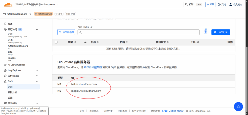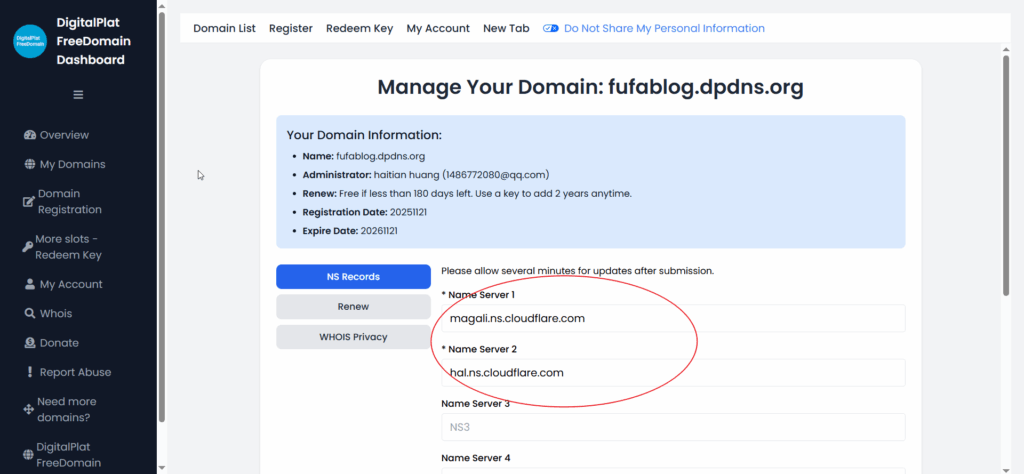 此时我们获得了cloudflare的dns服务器,我们分别复制粘贴到digitalplat的域名的name server1name server2里面,记得点击底部的更新按钮保存。