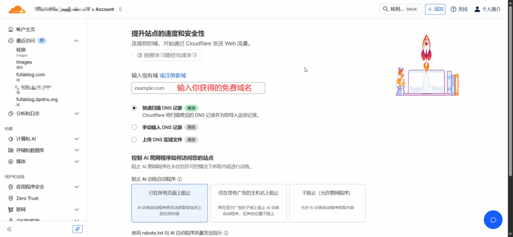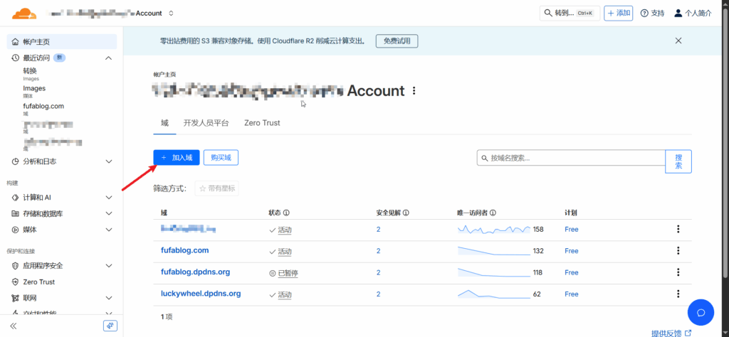 先进入cloudflare的官网,点击加入域,